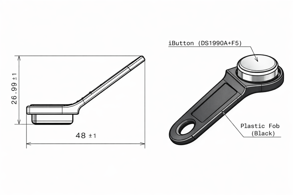 iButton jest osadzony w wytrzymałej, czarnej obudowie z tworzywa sztucznego, przystosowanej do codziennego użytkowania w trudnych warunkach pracy.